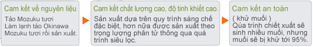 Để cung cấp nguồn Fucoidan tinh khiết hơn, sản phẩm được sản xuất theo quy trình tảo Mozuku chiết xuất thành Fukoidan – Tập trung – thành phẩm . Do đó, lượng chiết xuất Fucoidan nguyên chất chiếm hơn 80% sản phẩm.